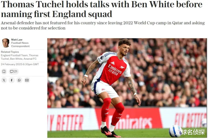 报道称,阿森纳的立场是继续支持本怀特的决定,无论他是否愿意重返英格兰队。